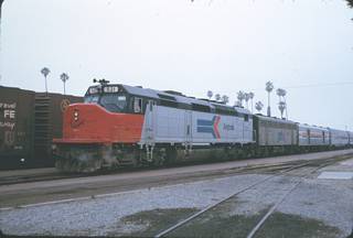 Pictures 64 - 70 - A San Diegan at Oceanside with a new Amtrak 500 series locomotive (plus an old 'B' unit). The last three cars on this train set are former Santa Fe high level 'El Capitan' cars.