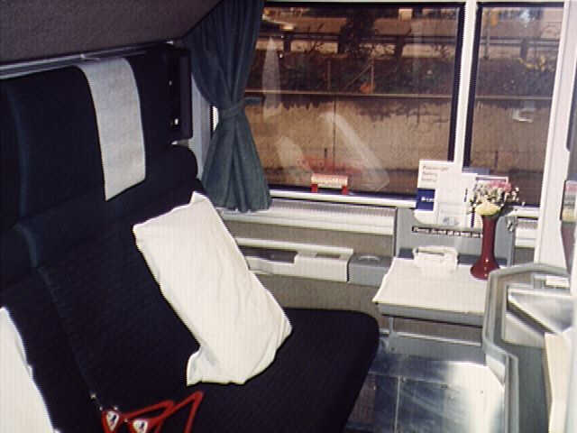 This is the far end of the Deluxe Bedroom. There is a couch on the left that runs the full length of the room. That opens to a bed for two at night and another bed for one folds out from above. To the right you can see a bit of the sink. There is a private toilet and shower in the room. Another movable chair is across from the couch that cannot be seen in this photo.